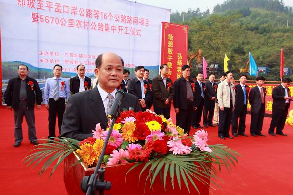 為貫徹落實自治區黨委、政府在全區掀起項目建設新高潮的決策部署,沖刺第四季度,完成全年公路建設目標任務,自治區交通運輸廳于11月3日舉行全區公路路網改造項目集中開工儀式。由集團公司承辦的分會場——那坡至平孟口岸公路等16個公路路網項目暨5670公里農村公路集中開工儀式在百色市那坡縣德隆鄉隆重舉行。自治區交通運輸廳紀檢組長、廳黨組成員朱名勝,百色市市委常委、政法委書記周武紅,市人大常委會黨組成員黃五同,集團公司黨委書記、董事長朱堅和、總經理李定倫、黨委副書記張友坐、副總經理劉明洪、總工程師覃炳賢,自治區公路管理局、百色市公路管理局、交通運輸局、那坡縣四家班子、集團公司直屬各單位領導及有關部門負責人等出席開工儀式。