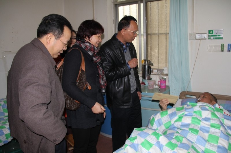 集團公司總經理李定倫(左三)和總工程師覃炳賢(左一)慰問生病住院的老黨員何家福同志